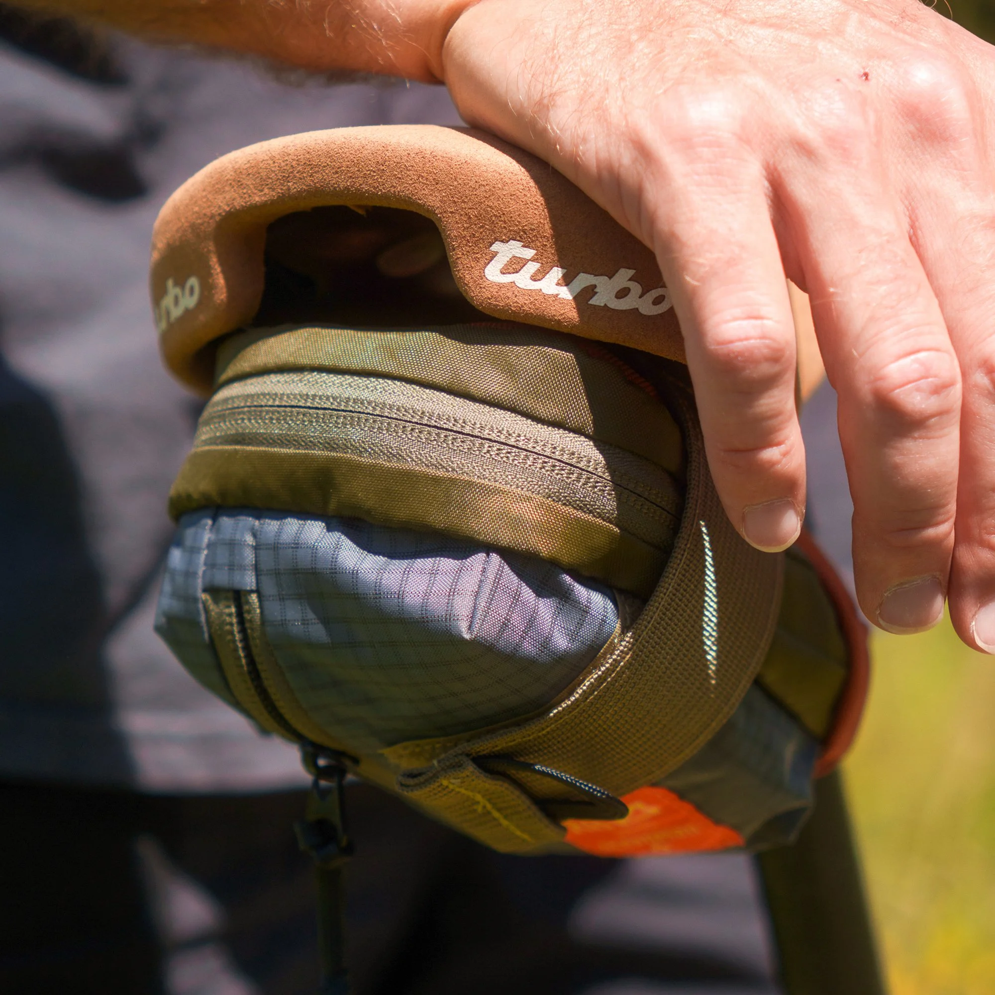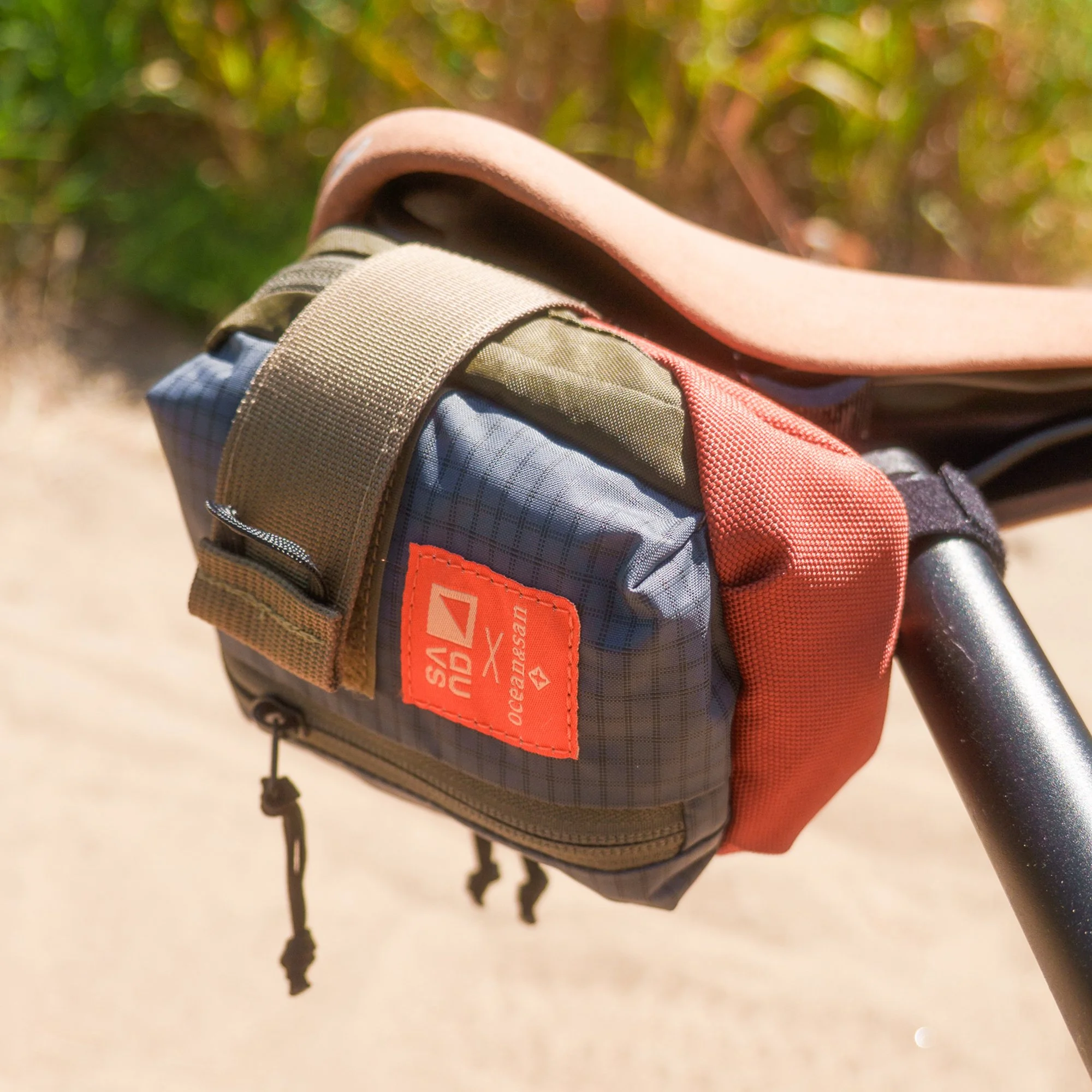We partnered with Ocean & San to create a compact Saddle Bag built for everyday rides. Designed to hold your ride essentials—multi-tool, snack, or phone—it’s your go-to storage solution for anything small but important. A zippered main compartment securely fits items like a point-and-shoot camera or your phone, while a roomy front zip pocket keeps smaller items—like keys or energy gels—within easy reach.